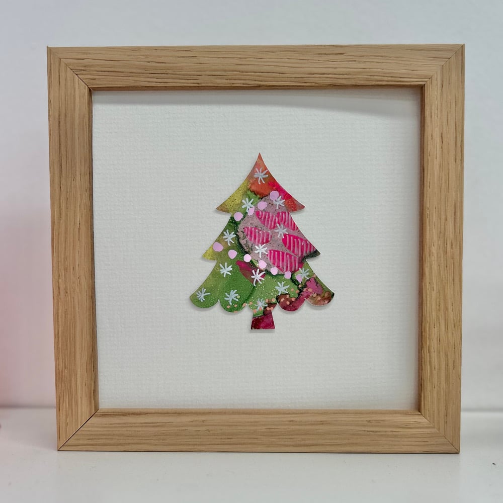 Each Christmas tree is lovingly handcrafted, making sure every piece is truly one-of-a-kind. Presented in a natural oak frame with glass protection and hand-signed by the artist. Designed to sit on your shelf or hang on the wall.