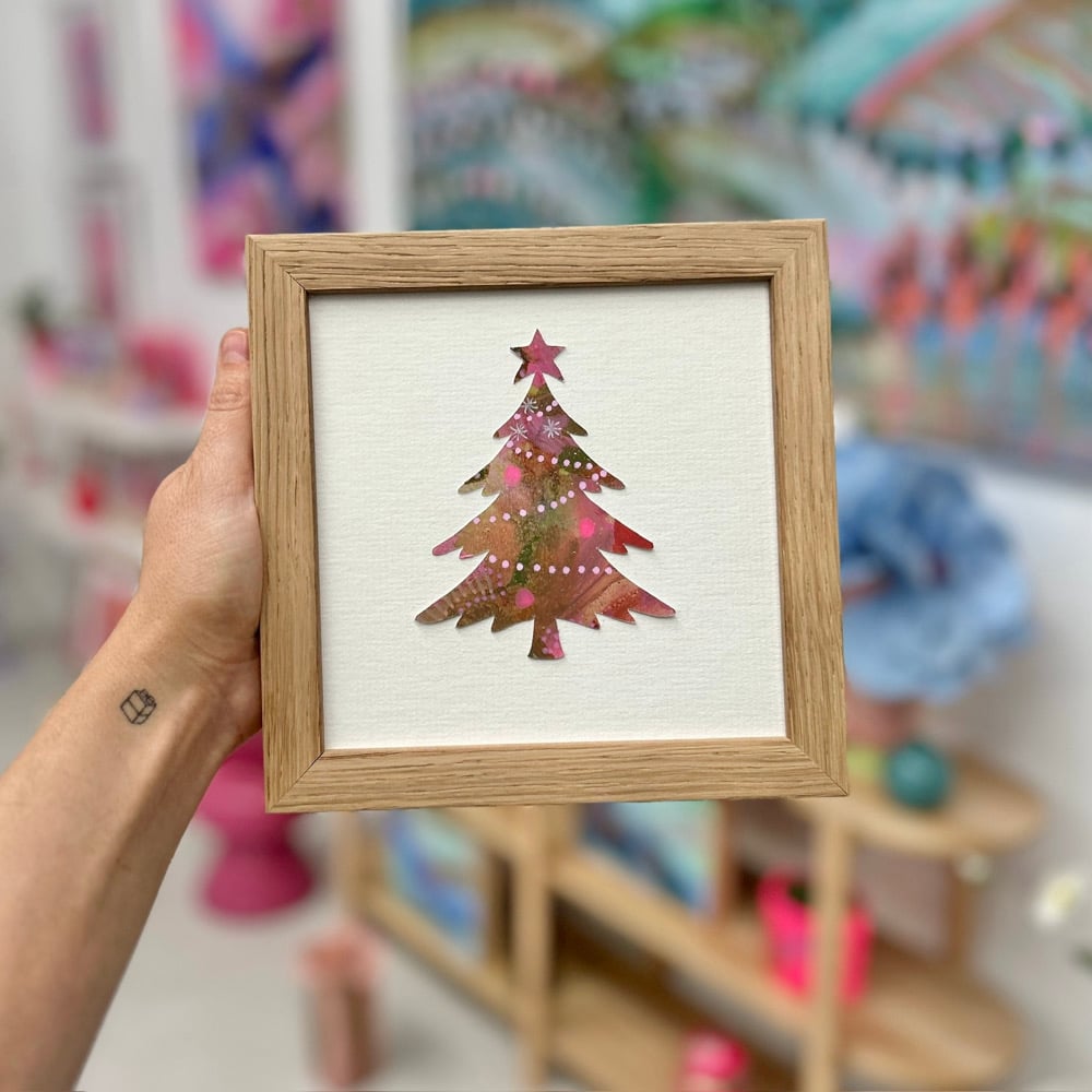 Each Christmas tree is lovingly handcrafted, making sure every piece is truly one-of-a-kind. Presented in a natural oak frame with glass protection and hand-signed by the artist. Designed to sit on your shelf or hang on the wall.
