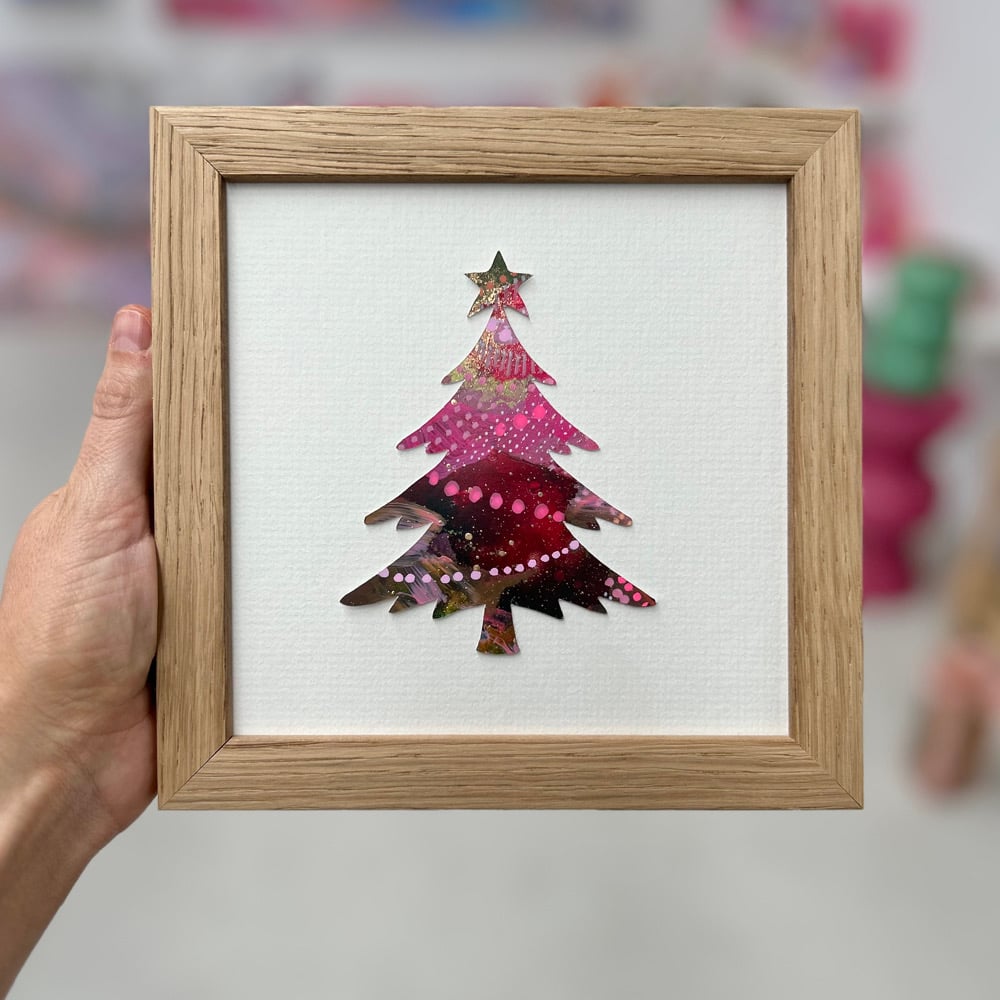 Each Christmas tree is lovingly handcrafted, making sure every piece is truly one-of-a-kind. Presented in a natural oak frame with glass protection and hand-signed by the artist. Designed to sit on your shelf or hang on the wall.