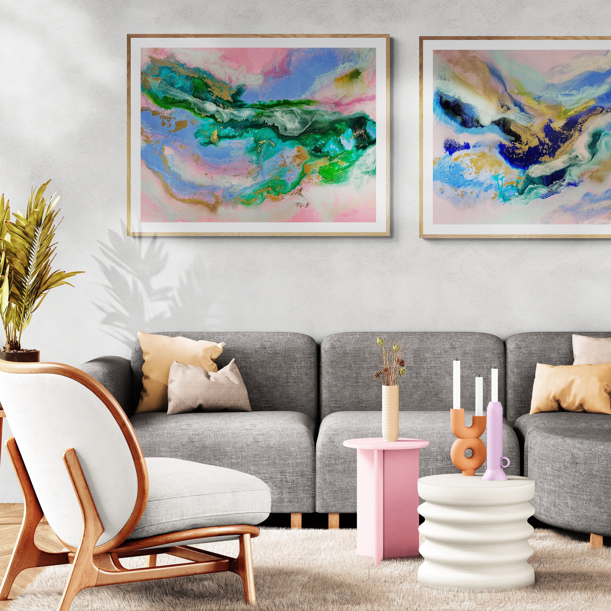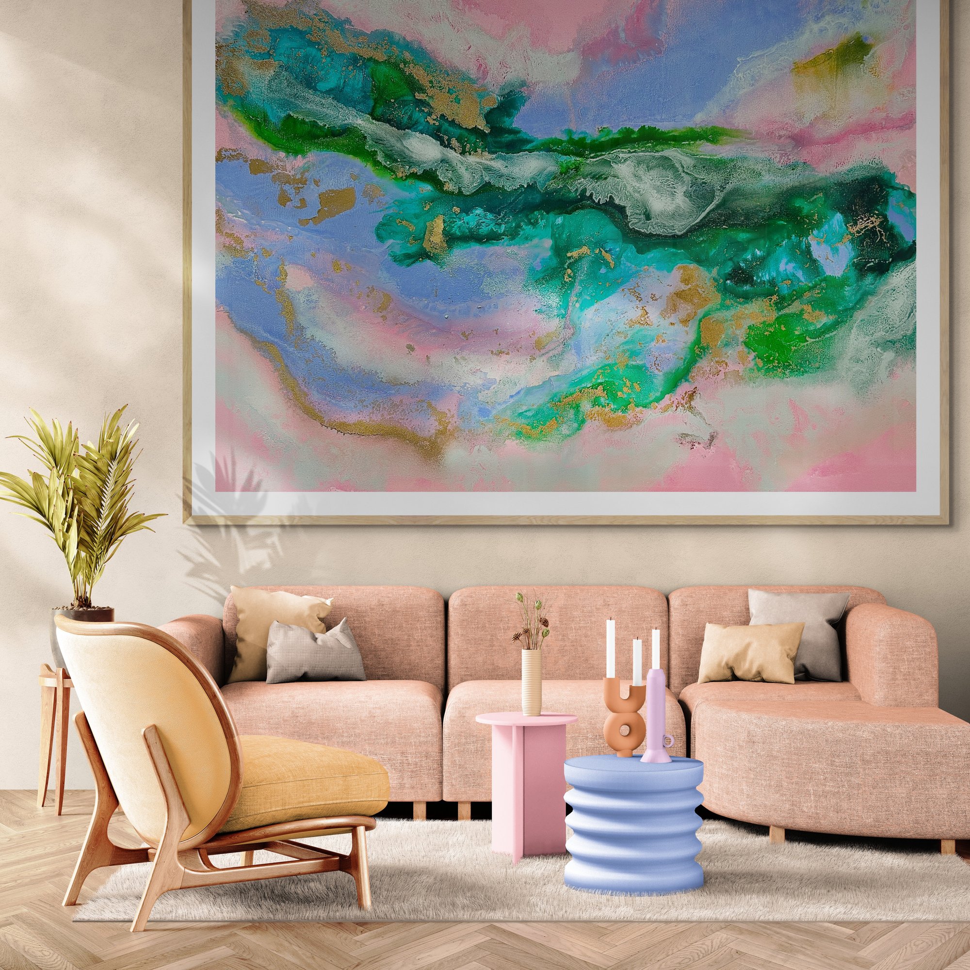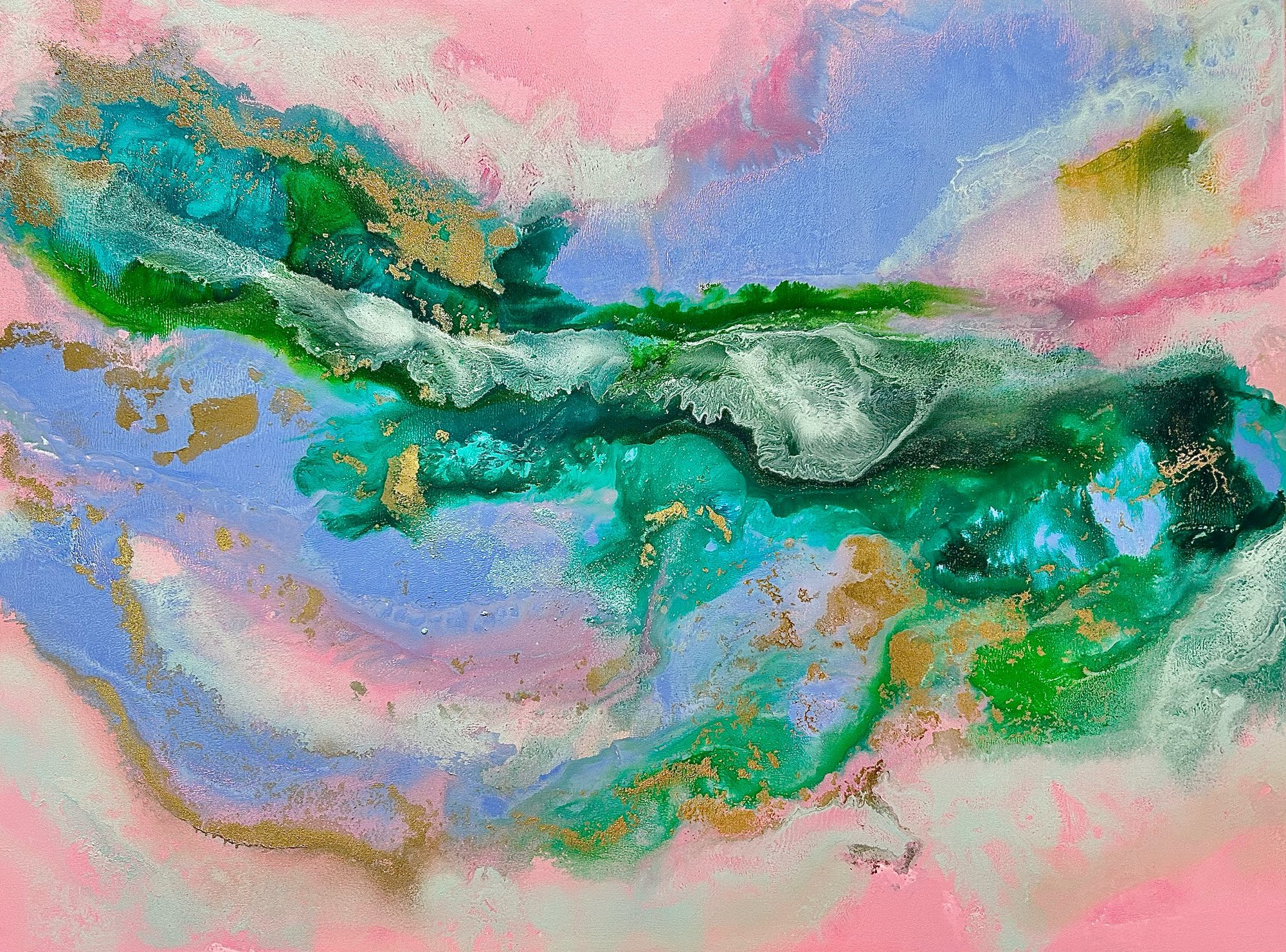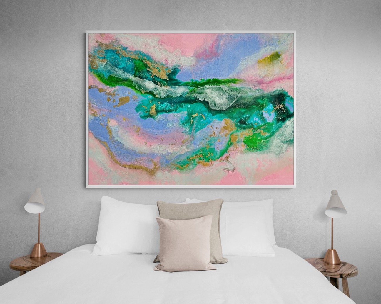 Mixed media on canvas, stretched and ready to hang. (No frame, see image of canvas on easel)